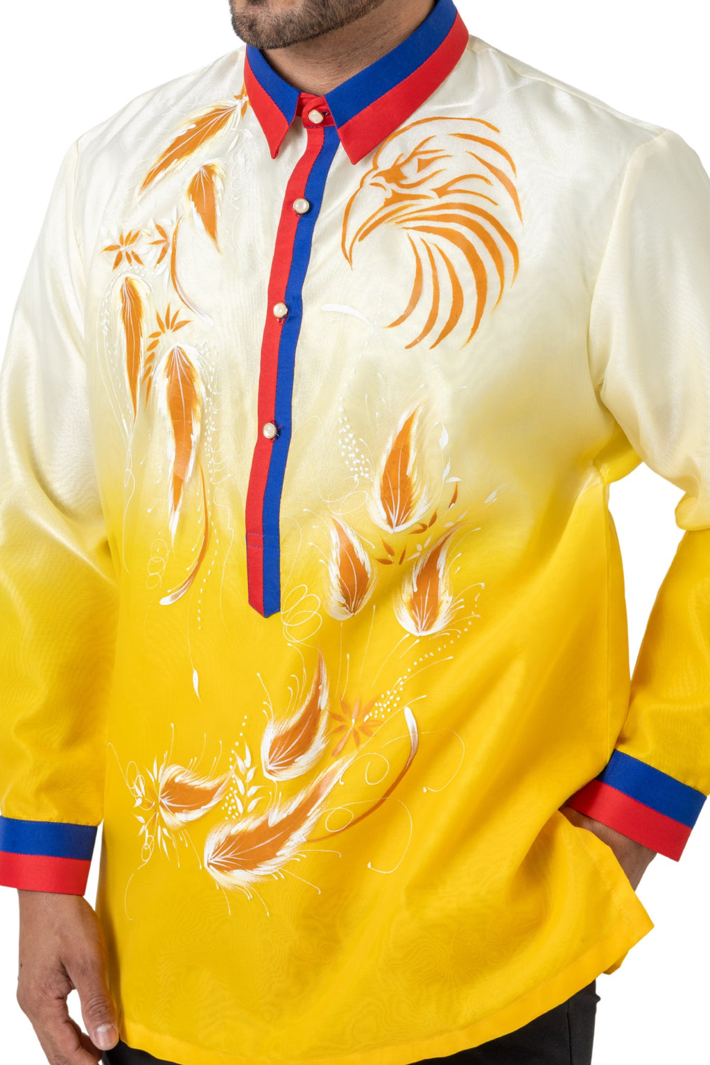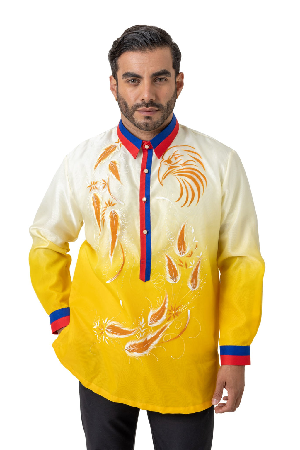 Stand out in any crowd with this barong that has eagle-inspired painting and the Filipino flag colors.